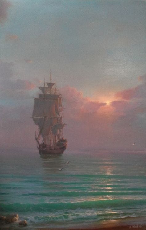 The ship sails off into the night.